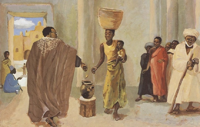• Una enseñanza (21,3-4). “Les aseguro que esta pobre viuda ha puesto más que nadie”: Dios mira más el corazón que las apariencias (1 Samuel 16,7). La viuda supera a cualquier escriba y a cualquier rico, porque éstos aportan desde la vanidad, mientras que ella da desde el amor. Su entrega es más auténtica. “Dio todo lo que tenía para vivir”: Ella da todo lo que posee, cuanto necesita para la subsistencia en el día presente. Se resiste a la vanagloria en lo religioso. Para Cristo, en la ofrenda lo decisivo no es la magnitud de los dones, sino el desprendimiento de la persona que la da; porque el egoísmo y el amor son como dos platillos de la misma balanza; no puede subir uno, si no baja el otro. Mensaje: Si mi limosna no disminuye mi egoísmo, no tiene valor ante Dios. Sin desapego, sin desprendimiento, es imposible adorar al Dios creador y liberador de los seres humanos.