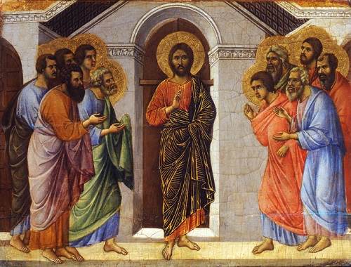 • Los discípulos están hablando de lo sucedido a dos de ellos en Emaús. Jesús irrumpe: «¡La paz esté con ustedes!». Ellos se espantan, tiemblan de miedo, creen que es un fantasma. La presencia inesperada de Jesús los sobrepasa.