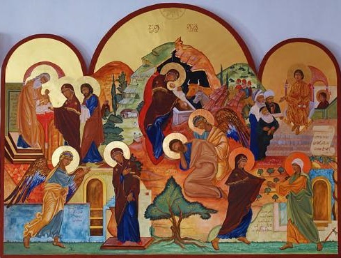 • Carlo Maratti (1625-1713) Estudio de la Virgen del Rosario / Icono de Ian Knowles de los Misterios del Rosario en el Santuario de Nuestra Señora de Monte Anjara en Jordania.