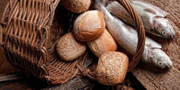 • Diálogo entre Cristo y los discípulos (9,11-14ª). Como se hace tarde, los discípulos sugieren al Señor despedir a las gentes, para que vayan a comprar algo de comer en los pueblos cercanos. Jesús les responde: “Denles de comer ustedes mismos”. Los seguidores del Maestro agregan que no tienen más que cinco panes y dos pescados: el número 7 es símbolo de perfección. Lección: Cristo invita a responder con lo que somos y tenemos a las necesidades del bien común.