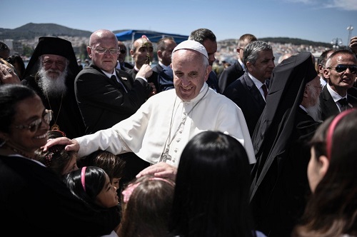 ⦁ El Patriarca Bartolomé, el Papa Francisco y el Arzobispo Ieronymos en la Isla de Lesbos, 16 de abril de 2016.